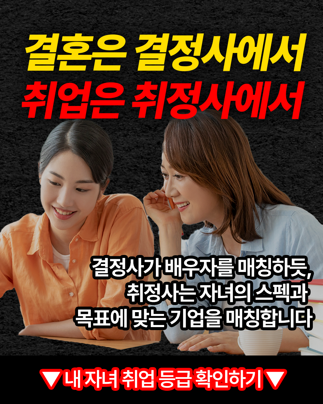 자녀 취업, 부모 마음처럼 쉽게 되지 않더군요. 요즘 부모님들의 가장 큰 걱정은 바로 자녀 취업 아닐까요? 학원 · 어학연수에 투자했지만 정작 취업 앞에선 막막한 경우가 많습니다. 결혼은 결혼정보회사, 취업은 취업정보회사에서 맡기세요. 삼성 · SK · 현대 등 대기업 출신 전문 멘토가 자녀 스펙과 목표에 맞는 전략을 매칭해드립니다. 자녀의 취업 등급과 합격 가능성, 무료로 확인해 보세요👇